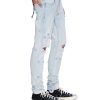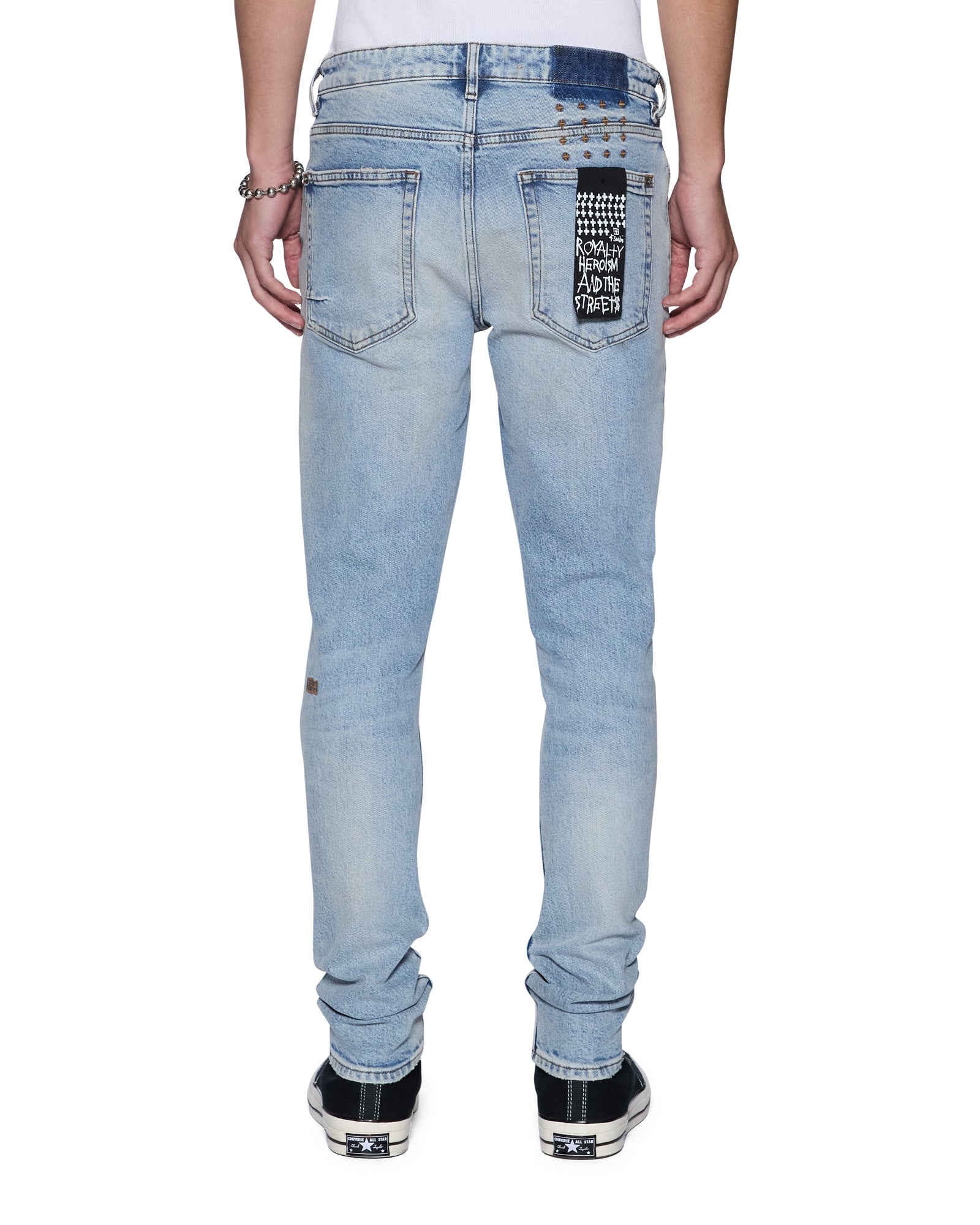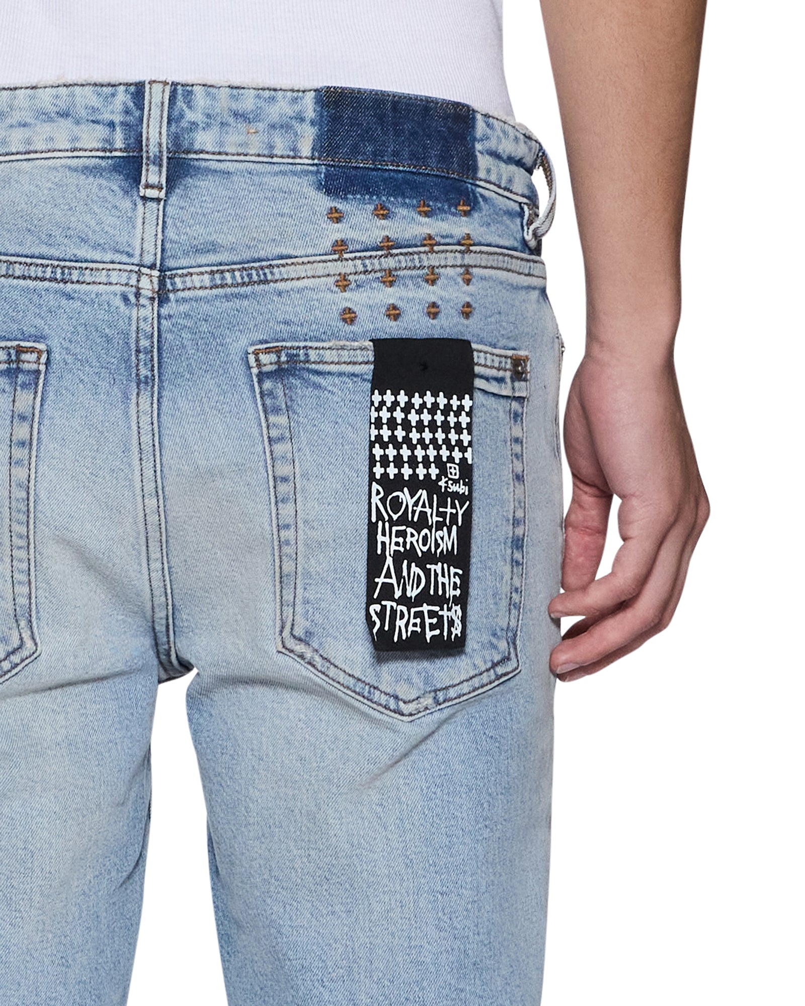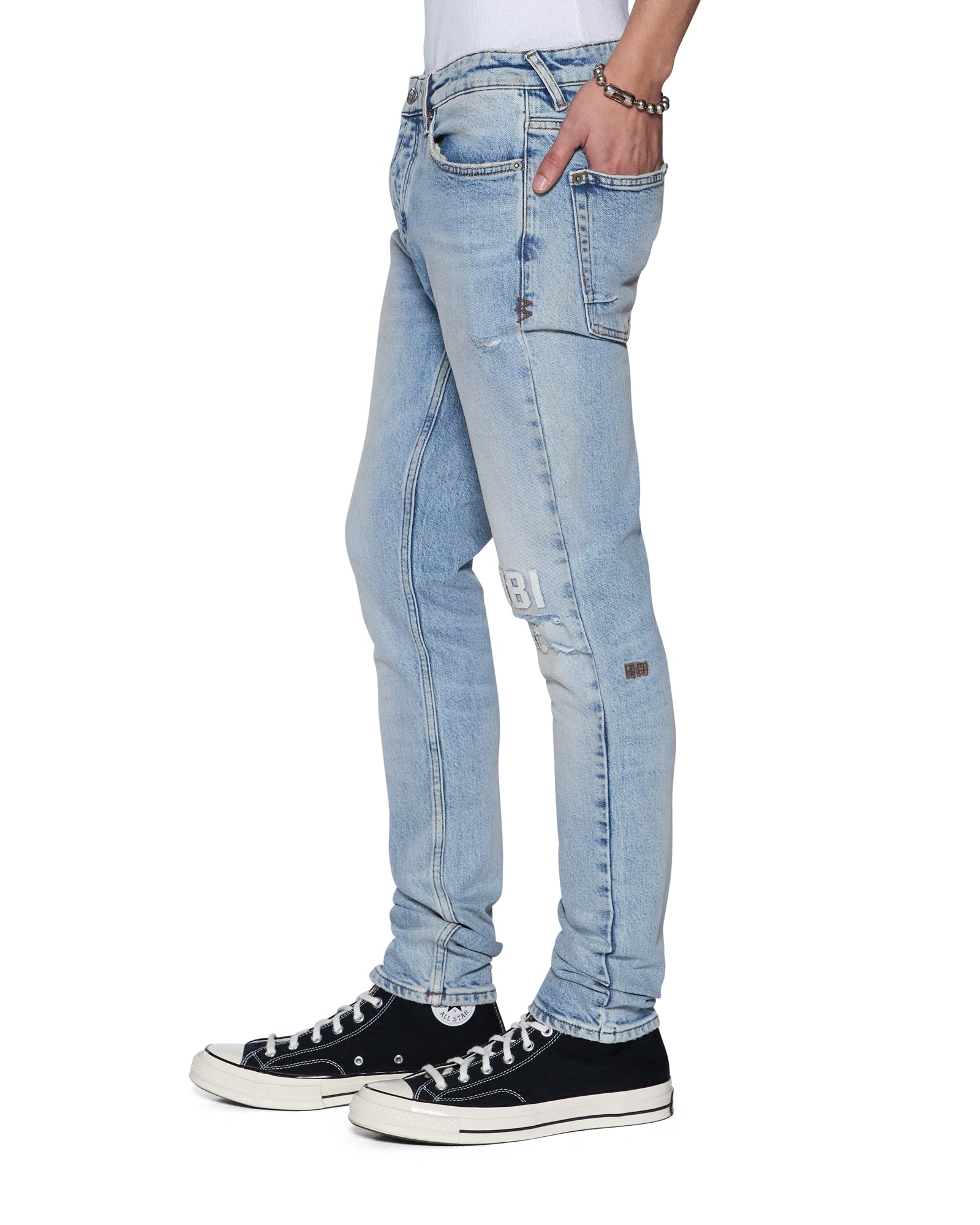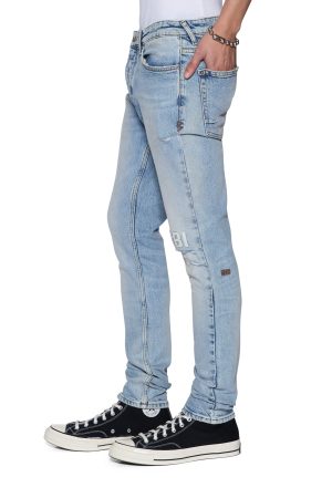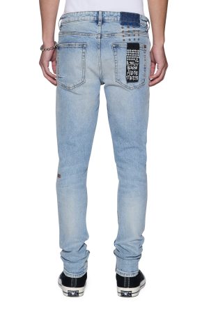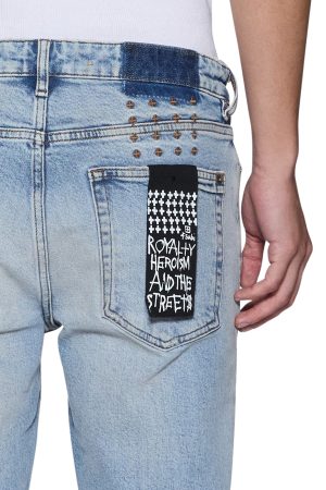 The Van Winkle Kasper Blue is a mid-rise five-pocket full-length skinny jean. Made from comfort stretch indigo denim with a heavy authentic stone wash. it is constructed with unique angled belt loops. front fly seam detail and aging treatments. It features a seasonal logo appliqued across the front leg above and below knee deconstructions. Finished with signature t-box and 4×4 embroidery. ghost patching detailing and Ksubi branded hardware.