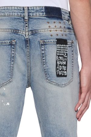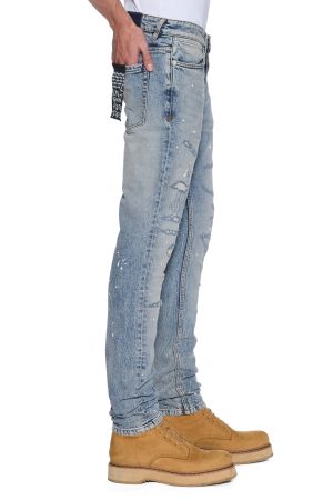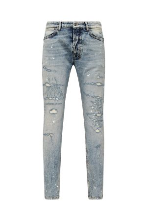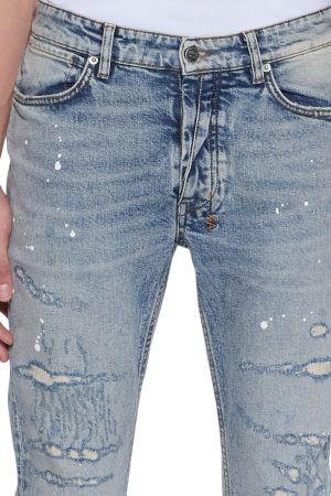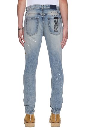 The Van Winkle Paint Summer Blue is a mid-rise. full-length skinny jean with a five-pocket design. Made from European comfort stretch denim with a heavily faded indigo. stonewashed look. it features strong seam ageing. heavy repaired deconstructions with traditional repair topstitching. and paint splatters. finished with contrast T-box and 4×4 embroidery. ghost patch detailing. and Ksubi hardware.