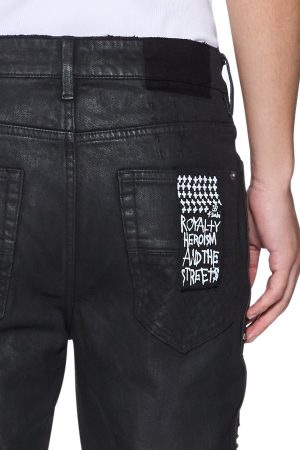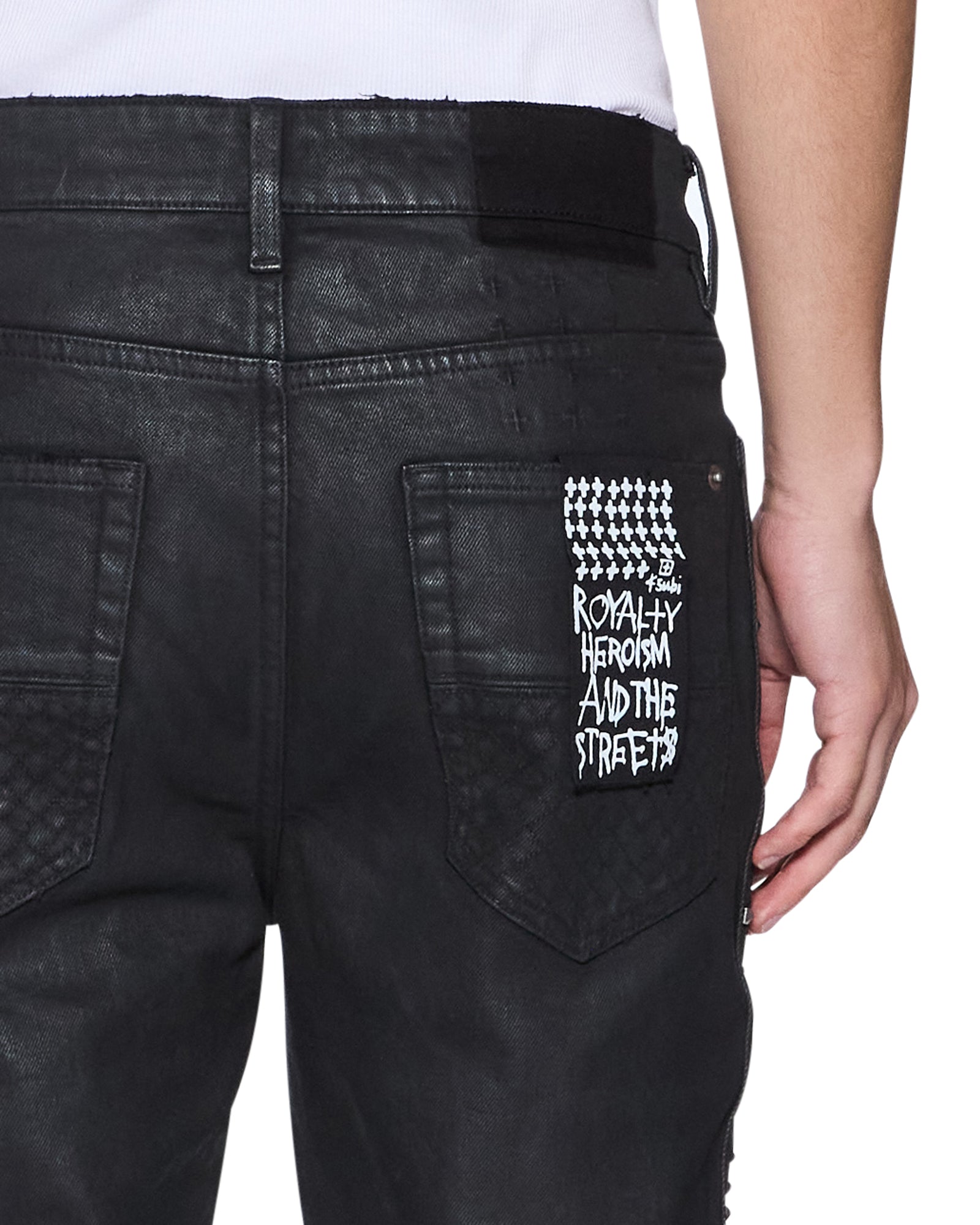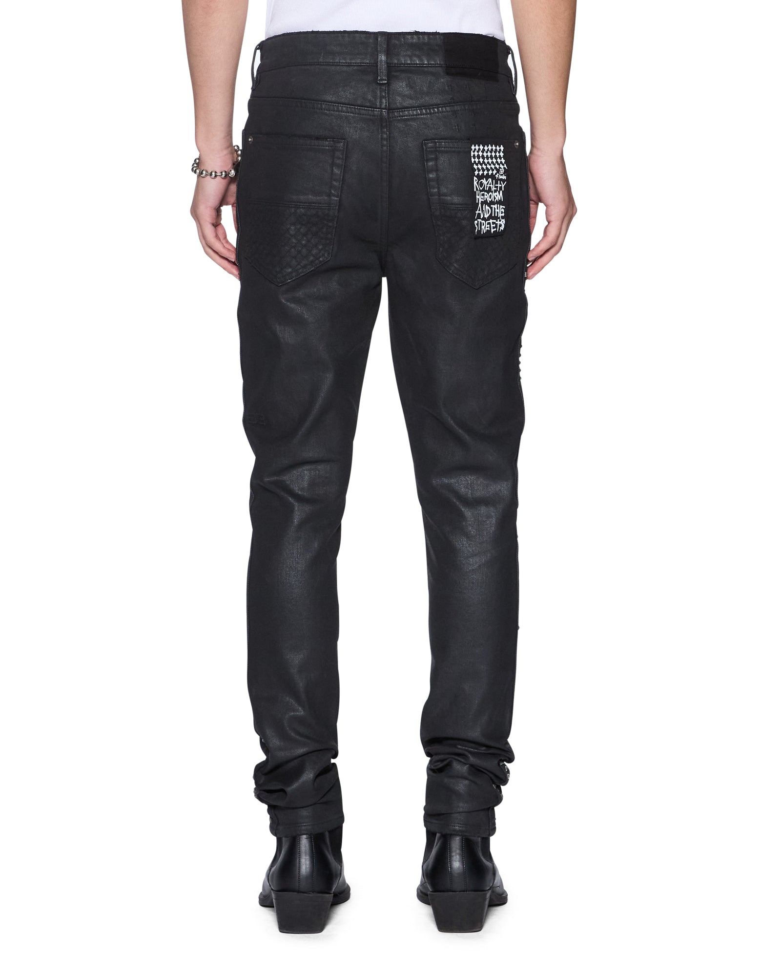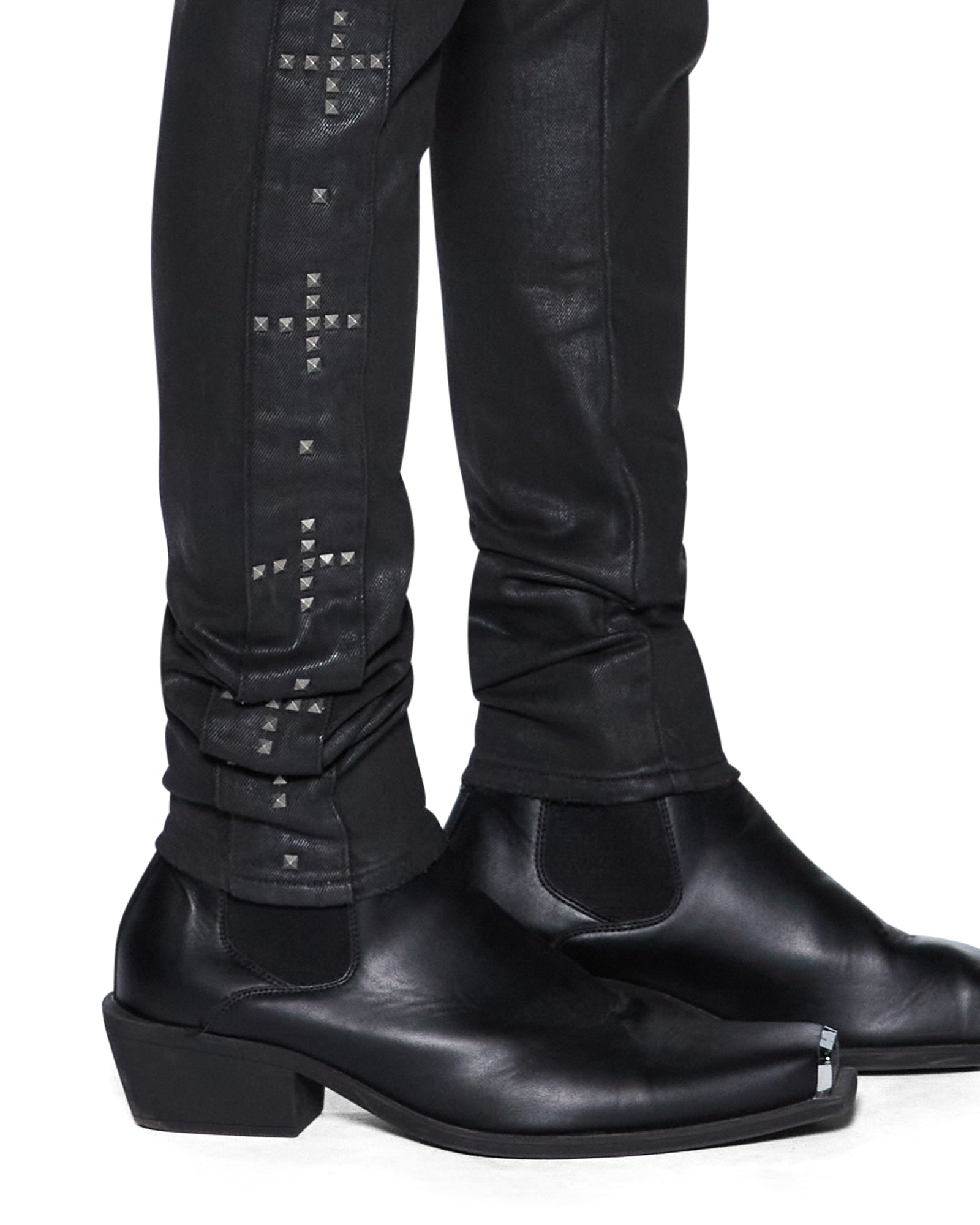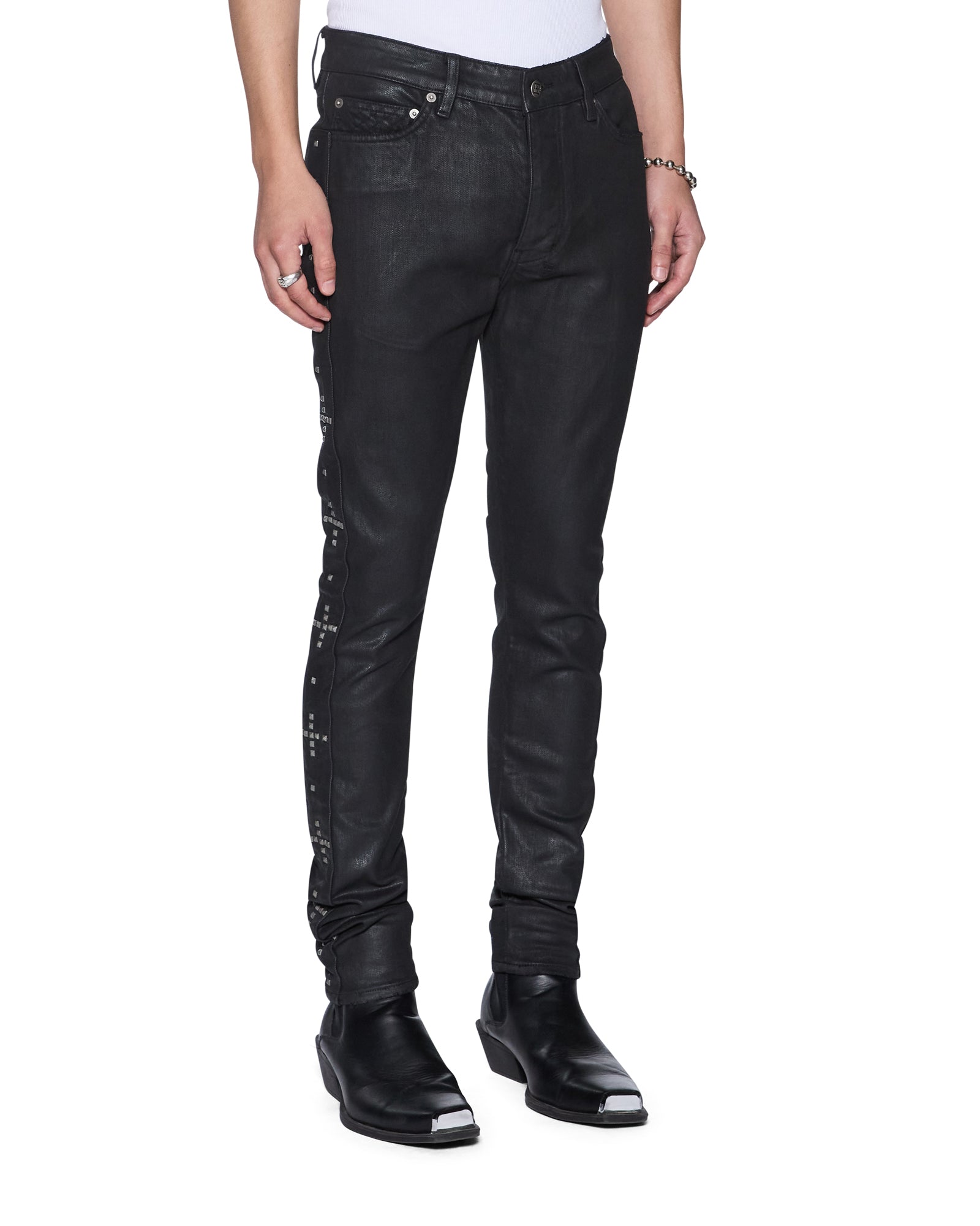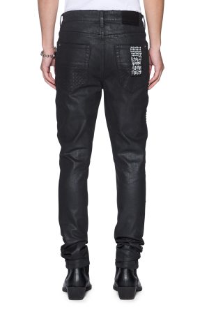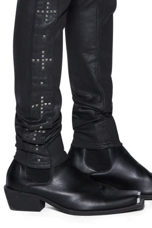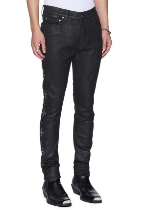 The Van Winkle Plus Studded is a mid-rise five-pocket full-length skinny jean. Made from stretch black denim with a wax wash and flock-coated finish. it is constructed with unique angled belt loops. front fly seam detail and aging treatments. It features a flocked contrast fabric side seam panel with a plus-stud pattern running down the leg and a black leather backed metal plate at the coin pocket. Finished with hot-fixed diamante t-box and 4×4. ghost patching detailing and Ksubi branded hardware.