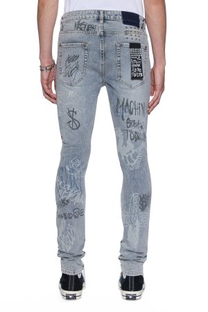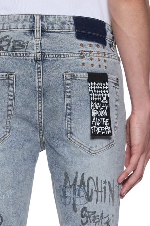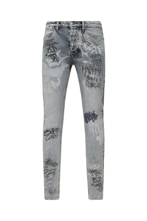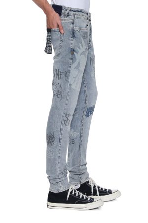 The Van Winkle Rogue Blue Graffiti is a mid-rise. full-length skinny jean with a five-pocket design. Made from European indigo comfort stretch denim with a heavy stonewash and authentic ageing treatments. it features strong seam ageing in natural wear areas. seasonally printed graffiti artwork throughout. ghost patch detailing. and finished with contrast T-box and 4×4 embroidery an