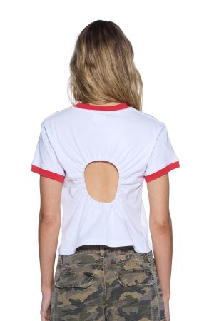 The Varsity Shrunken SS Tee White is a relaxed mini tee featuring a crew neck. short sleeves. and a regular length. Made from premium cotton jersey in a fresh white colourway. it showcases a varsity-inspired Ksubi graphic on the front and a circular cutout at the back with a ruched elastic bungee cord for adjustable styling. Finished with signature T-box embroidery.