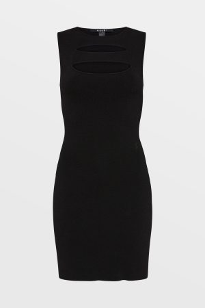 The Vertigo Dress Black is a sleeveless mini dress with a body skimming fit. open back and double fully fashioned cutouts on the front. This style is constructed from premium viscose blend yarn in a black colourway with a dry hand feel in a body sculpting full milano stitching. Signed off with t-box embroidery branding. Consider this the new ‘Hex Dress’. an update of our best selling knitted dress.