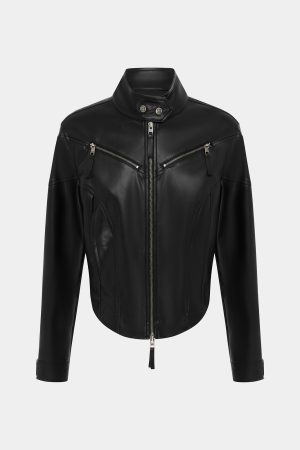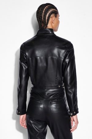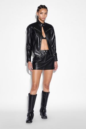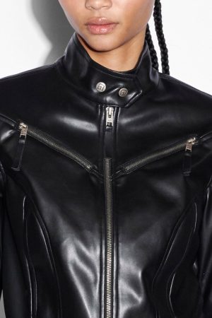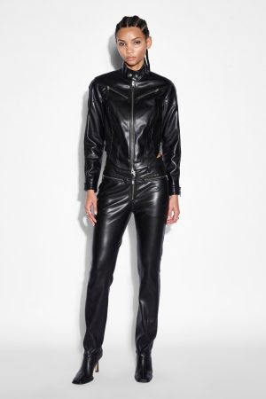 Elevate your look with the Vivienne Jacket Black. Fitted through the body. with slim-line sleeves this jacket gives a flattering silhouette inspired by vintage motorcycle jackets. Made from a premium faux leather with a soft-handfeel. designed to style back with the Vivienne Pant Black complete the look. This jacket features angled front yoke. exposed metal zip-pockets. panelling details and shaped hem-band with Ksubi branded hardware. Finished with our signature branding.
