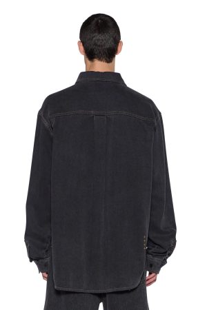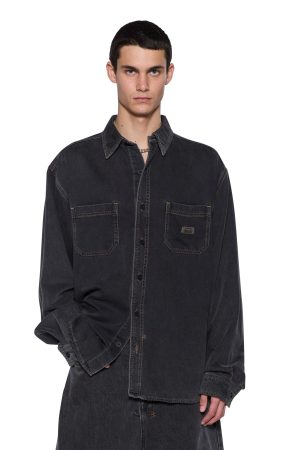 The Vulture Denim Long Sleeve Shirt Baxter Black is a classic denim shirt fit with mitered squared-off pockets. Made from a heavy 100% cotton denim shirting in a vintage black stonewash with worn-in highlights. Finished with our metal plate.