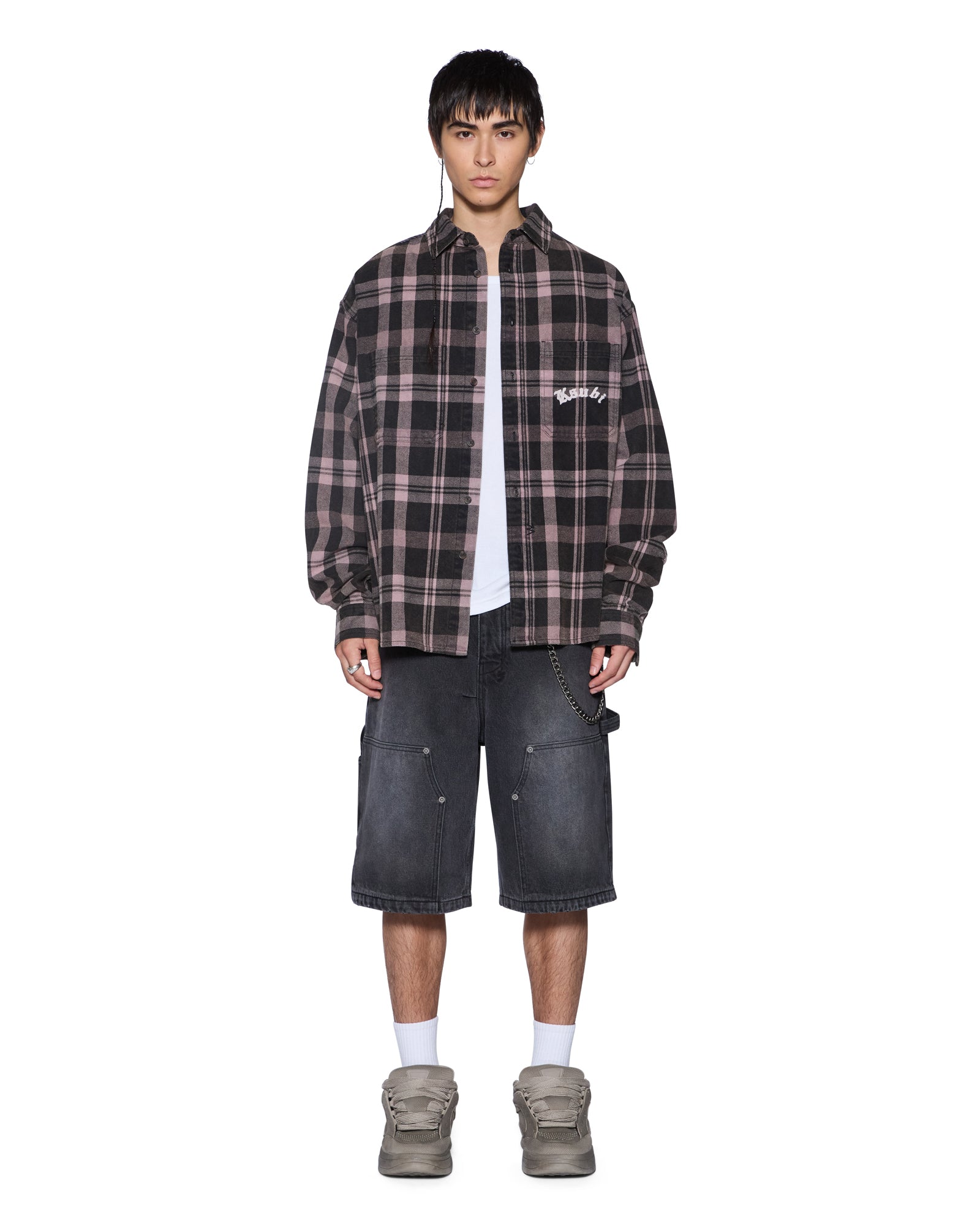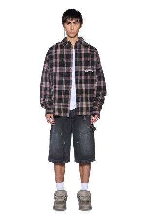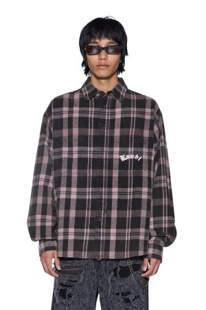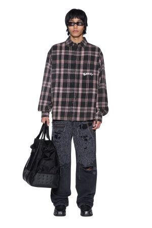The Vulture Flannel Shirt Plum is an oversized long-sleeve button-down flannel shirt with a scooped back hem. cut from soft cotton flannel in a black check pattern and treated with a softening garment wash. Designed with chest pockets featuring button closures. a front buttoned placket. and seasonal chain stitched Ksubi embroidery on the front pocket and back. it’s finished with signature T-box and 4×4 branding and Ksubi branded hardware.