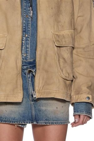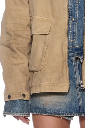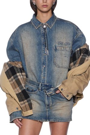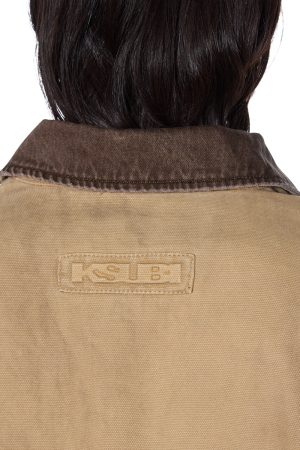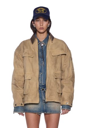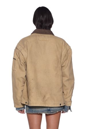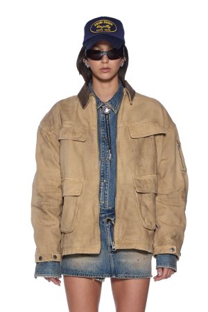 The Workwear Jacket Sierra is an oversized workwear style jacket. made from a premium stone-washed canvas. finished with grease stains and distressed markings for a worn-in look. With padded flannel lining for warmth. including a contrasted brown denim collar and shoulder padding. this classic piece will become a winter wardrobe staple.