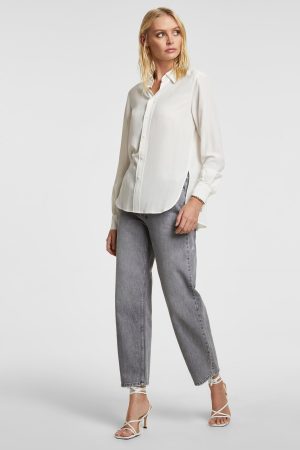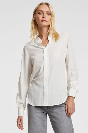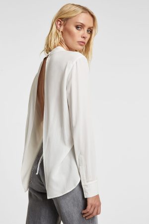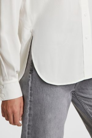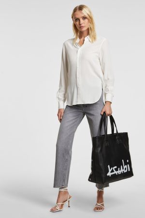 The Xzibit Shirt White is a collar shirt with relaxed fit. long sleeve and curved hem. Made from a premium light-weighted 100% silk crepe. in a white colourway. This style features mocked front button closure. back split. ksubi logo back tie and Kusbi branding.