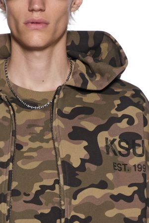 The Zip Thru Halen Hoodie Camo is a boxy. waist-length hoodie with a full zip front and twin zippers. Made from multi-colour camouflage loop-back fleece. it features front pockets. Ksubi State artwork printed on the front and hood. and is finished with signature T-box and 4×4 detailing.